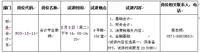 财务会计系财务会计专业教师(B05-15-11)岗位试讲时间定于5月5日(周二)在学院下沙校区举行。