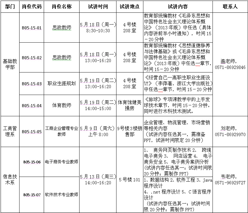 2、试讲前,须提前30分钟到试讲地点进行资格复审,所带材料见学院4月30号学院外网通知《浙江经贸职业技术学院2015年公开招聘教师资格审查结果及笔试(技能测试)、试讲公告》。部分岗位参加笔试前已经资格复审的,无需再提交材料。