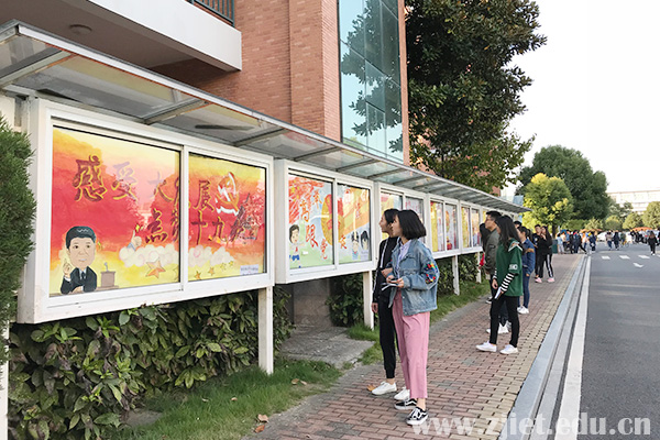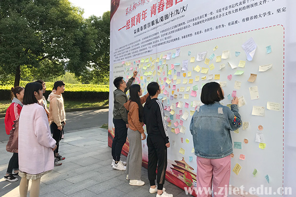 与此同时,校团委在全校开展了“不忘初心跟党走 青春建功新时代”青春誓言征集活动。线上,号召广大团员青年在“经贸青年”微信公众号主题推文下发表青春誓言;线下,在宣传栏集中展示“感受大发展 点赞十九大”主题系列手绘海报,并在图书馆西侧设置主题喷绘,现场征集并展示青春誓言。活动得到广大团员青年们积极响应,共收到青春誓言1000余条。