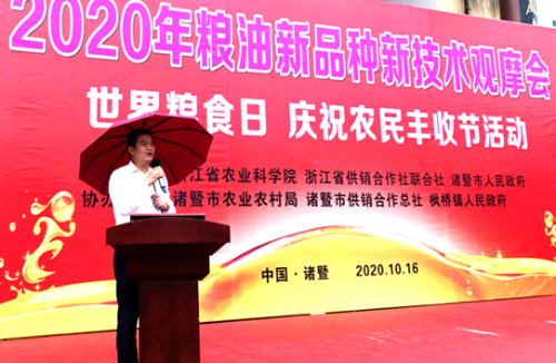 10月16日,省供销社和省农科院在诸暨举办粮油新品种新技术观摩会暨2020年世界粮食日活动。省供销社党委委员、理事会副主任童日晖出席活动并致词,各地粮油产业农合联会员及社属相关企业参加活动。