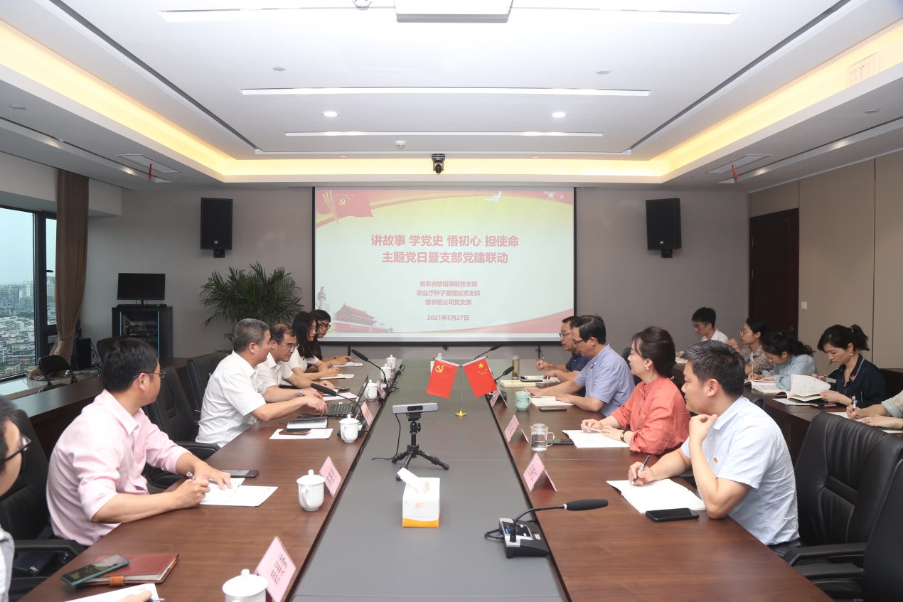 5月27日,省农合联指导部联合省农业农村厅种子管理站、省农担公司党支部在省农担公司举行“讲故事、学党史、悟初心、担使命”主题党日暨支部党建联动活动,省供销社党委委员、副主任童日晖以《巩固和完善农村基本经营制度》为题讲授党课,省种子管理站站长施俊生、省农担公司董事长李建斌、省农担公司总经理赵虹、省农担公司监事长陶官军等参加本次活动。