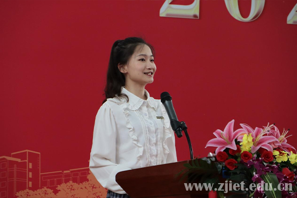 2022届毕业生代表、国家奖学金获得者吴漾发言。她围绕“无悔”和“感恩”两个关键词,讲述了在经贸参与技能竞赛、服务师生、实习锻炼的奋斗故事,鼓励全体毕业生砥砺前行,发出“技能成才 强国有我”的青春最强音。