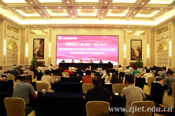 8月24日至8月27日,学校在嘉兴平湖举行学习贯彻省第十五次党代会精神专题培训班暨2022年暑期读书会。会议以“凝聚经贸力量 践行‘两个先行’”为主题,旨在深入学习贯彻省第十五次党代会精神,准确领会省党代会精神实质,在省第十五次党代会擘画的宏伟蓝图中找准定位,借势借力放大办学优势,为浙江“两个先行”作出经贸贡献。学校党政领导班子成员、全体中层干部参加读书会。