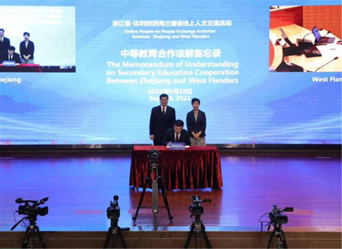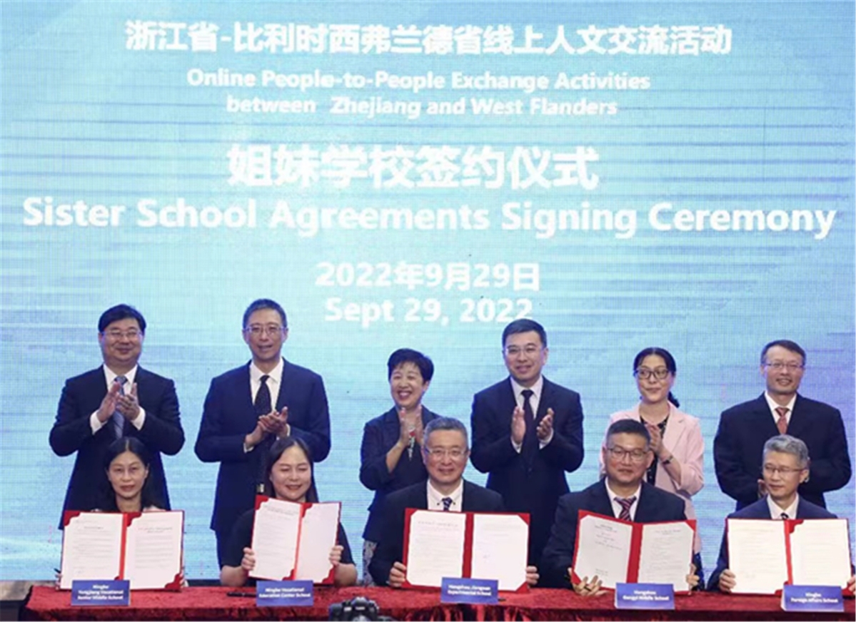 活动上,省教育厅与西弗兰德省经济及欧洲与国际事务厅签署了中等教育合作谅解备忘录。杭州江南实验学校、杭州公益中学、宁波外事学校、宁波市职业技术教育中心学校、宁波市甬江职业高级中学等5所学校与比利时西弗兰德省4所中学签订了姐妹学校协议。两省专家就后疫情时代推动姐妹校合作高质量发展作主旨报告。双方师生通过云端对话,开展了深入探讨与交流。杭州市江南实验学校的同学们表演了精彩节目。