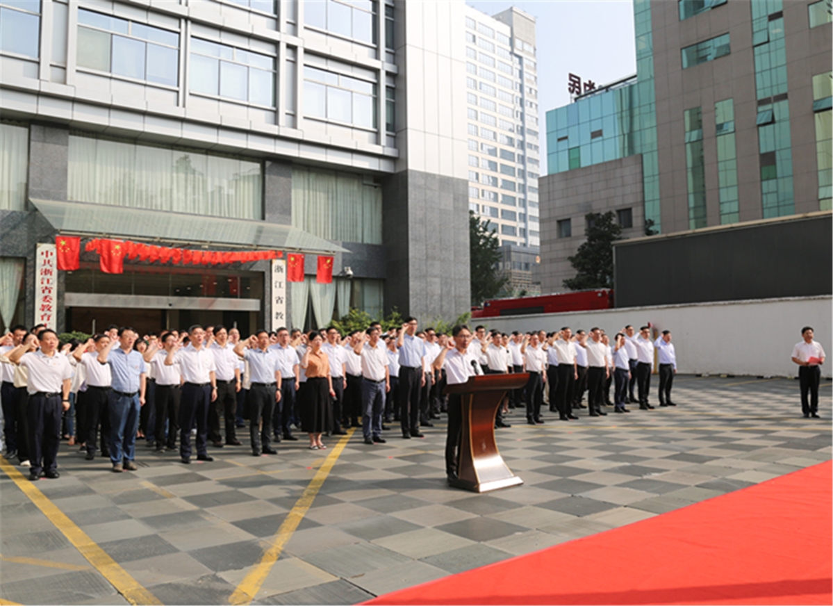 升旗仪式后,全体宣誓人面向国旗,领誓人左手抚按宪法,右手举拳,领诵誓词,其他宣誓人跟诵誓词。宣誓后,陈春雷指出,宪法誓言字字千钧,向宪法宣誓,既是一种荣誉,更是一份责任。他强调,参加宣誓的同志要牢记誓言,以此次宪法宣誓为契机,深入学习贯彻习近平新时代中国特色社会主义思想,深学笃行习近平法治思想,坚决做到信念过硬、政治过硬、责任过硬、能力过硬、作风过硬,努力为浙江教育高质量发展作出新的更大贡献,以优异成绩迎接党的二十大胜利召开。