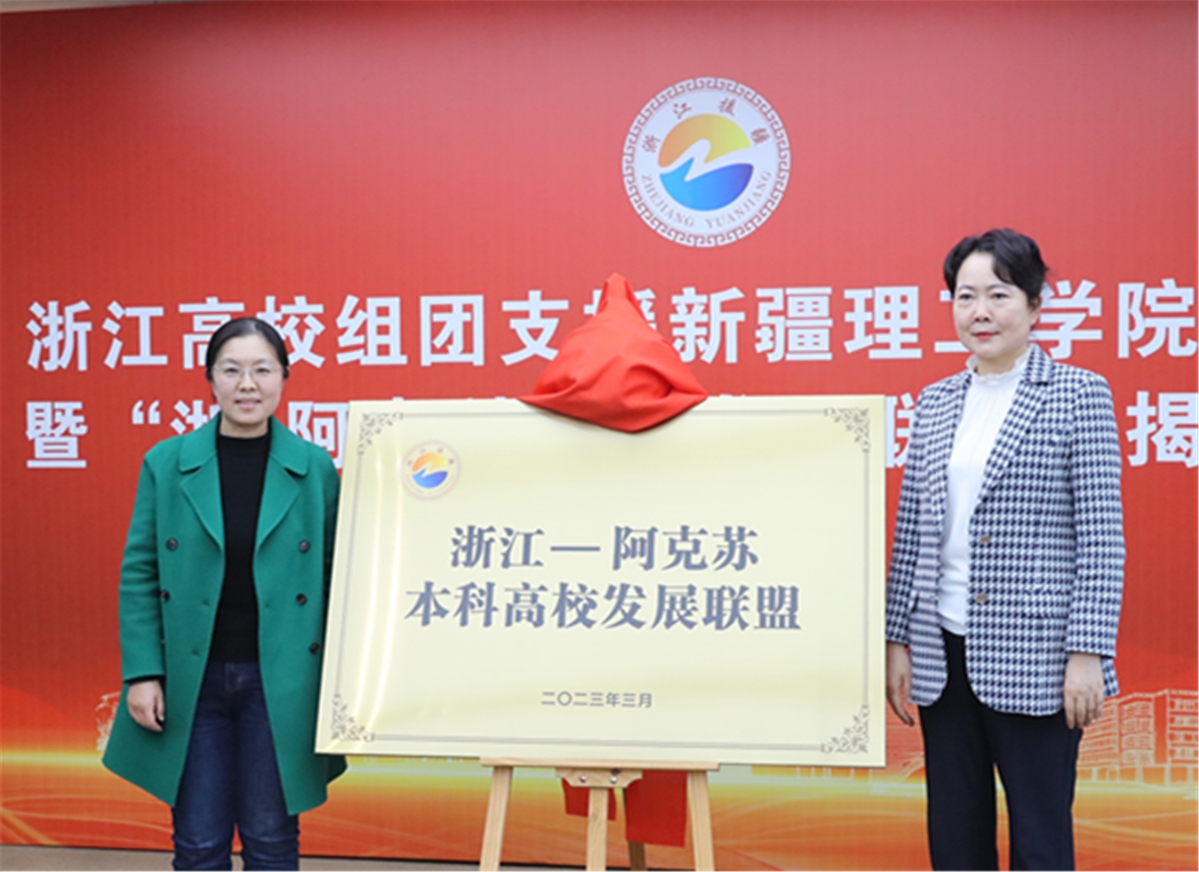 3月6日下午,浙江高校组团支援新疆理工学院推进会暨“浙-阿本科高校发展联盟”揭牌仪式在浙江理工大学举行。新疆维吾尔自治区教育厅副厅长、教育部科技司副司长、一级巡视员李楠发表视频讲话。阿克苏地区行署副专员、地委教育工委副书记王新春,浙江省委教育工委委员、省教育厅党组成员、副厅长白红霞出席仪式并为“浙-阿本科高校发展联盟”揭牌。新疆阿克苏地区教育考察团,在杭本科高校相关负责人参加仪式。