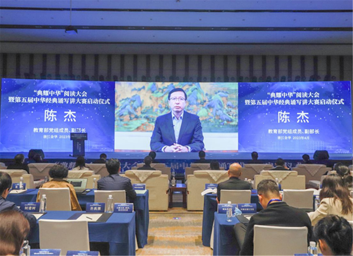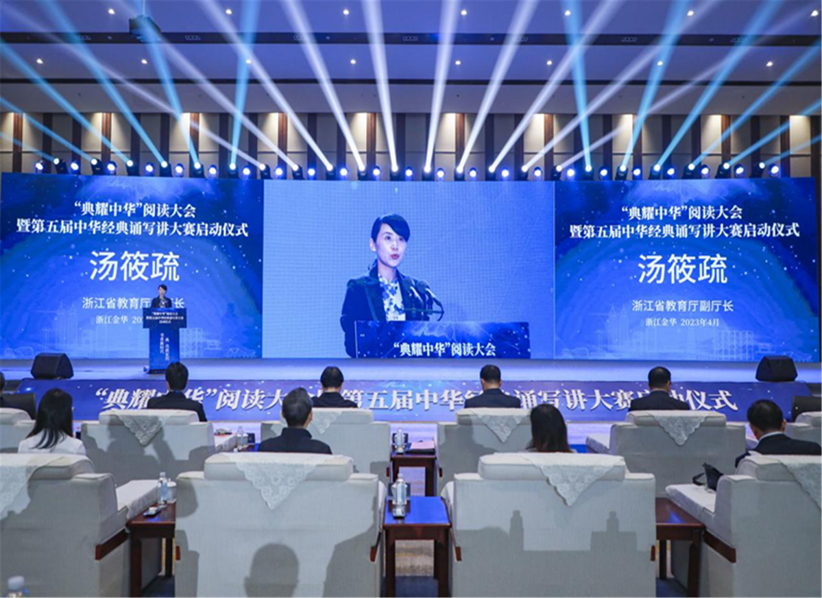 4月13日,“典耀中华”阅读大会暨第五届中华经典诵写讲大赛启动仪式在金华举行。教育部党组成员、副部长陈杰视频致辞,省教育厅副厅长汤筱疏出席并发言。