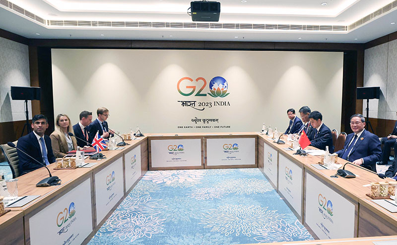 当地时间9月10日上午,国务院总理李强在新德里出席二十国集团领导人峰会期间会见英国首相苏纳克。新华社记者 姚大伟 摄