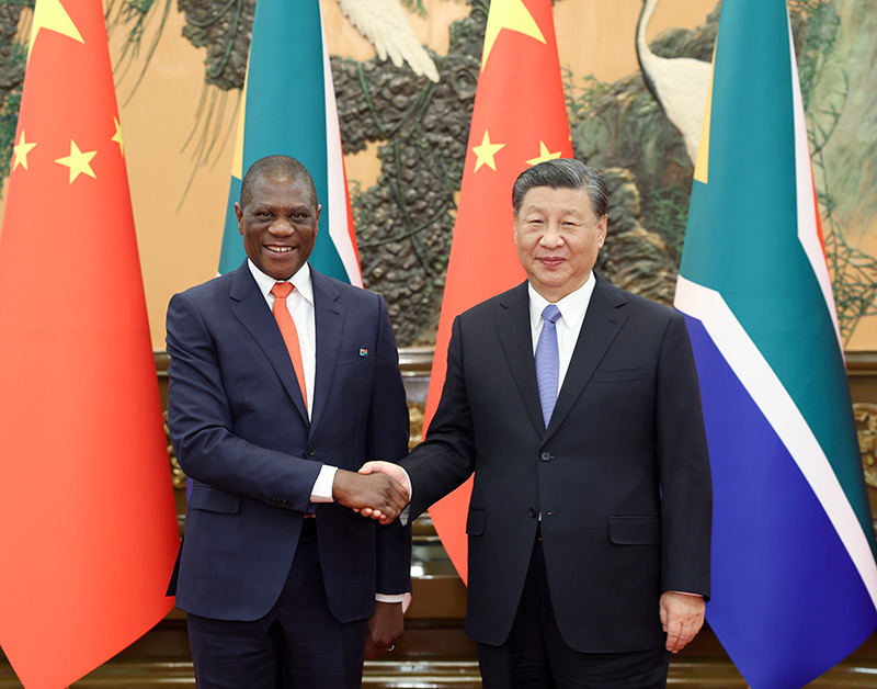 习近平强调,中方支持南非探索符合本国国情的现代化道路,愿同南非进一步夯实政治互信基础,提升互利合作水平。中方愿同南非等非洲国家一道,落实中国支持非洲工业化、农业现代化、人才培养三项举措以及高质量共建“一带一路”的八项行动,打造一批高标准、惠民生、可持续的合作项目,提升中非合作的战略性和可持续性,推动构建高水平中非命运共同体。双方应继续密切在金砖国家机制内合作,加强发展中国家团结合作,推动全球治理体系朝着有利于发展中国家的方向发展。