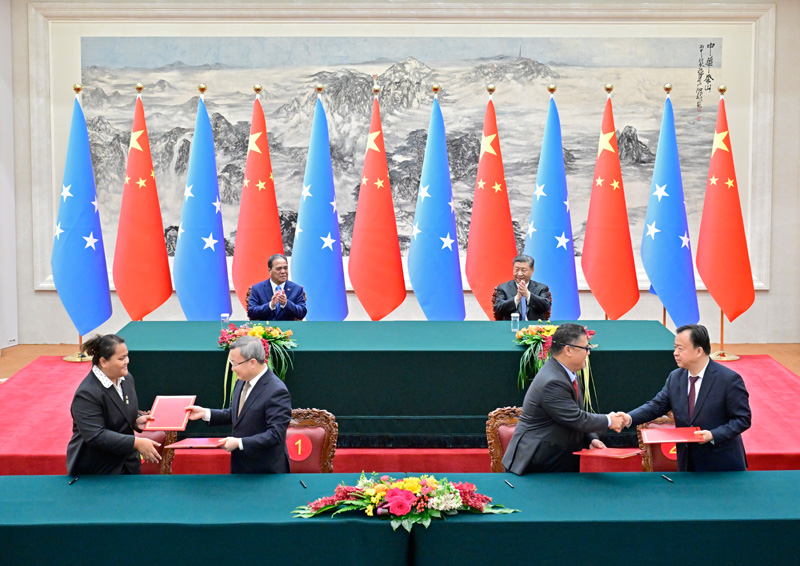 4月9日下午,国家主席习近平在北京人民大会堂同来华进行国事访问的密克罗尼西亚联邦总统西米纳举行会谈。这是会谈后,两国元首共同见证签署关于共建“一带一路”、绿色发展、农业、医疗卫生、基础设施、发展合作等领域多项双边合作文件。新华社记者 岳月伟 摄