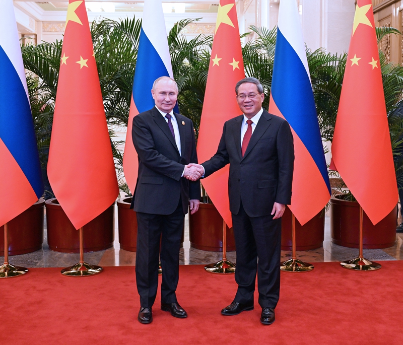 5月16日下午,国务院总理李强在北京人民大会堂会见来华进行国事访问的俄罗斯总统普京。新华社记者 饶爱民 摄