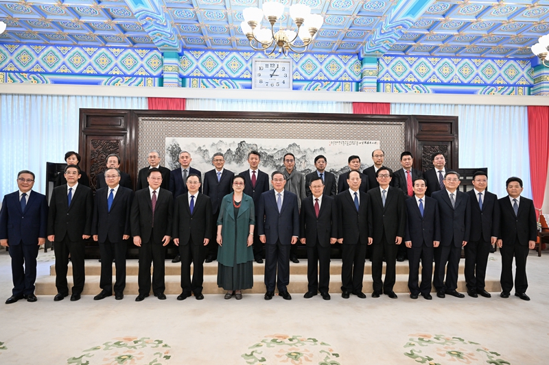 6月26日,中共中央政治局常委、国务院总理李强向新聘任的国务院参事刘实、常继乐、李卓彬、尹中立、卢琦、张平、刘卫东和中央文史研究馆馆员孙晓云、张平、赵汀阳、荣新江、万建中颁发聘书。这是颁发聘书后,李强同大家合影留念。新华社记者 饶爱民 摄