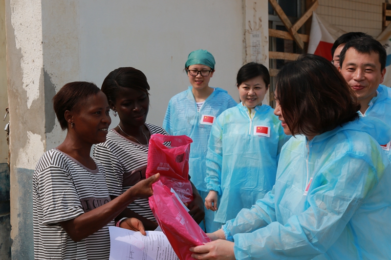 2015年4月4日,在位于塞拉利昂首都弗里敦市郊的中塞友好医院埃博拉诊疗中心,中国第四批援塞医疗队副队长邵蔚(右前)向被治愈的埃博拉出血热患者赠送礼物。新华社发(祖荣强 摄)