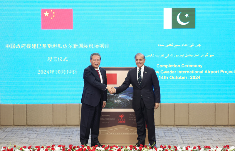 当地时间10月14日,国务院总理李强在巴基斯坦总理府同巴基斯坦总理夏巴兹共同出席瓜达尔新国际机场项目竣工仪式。