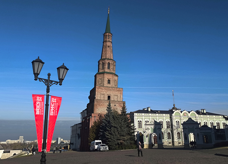 夜幕下的喀山,处处流光溢彩。一辆辆载着各国贵宾的车辆掠过克里姆林宫城墙“金砖灯光秀”,驶向自由广场上的喀山市政厅。