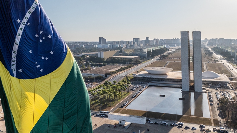 这是2024年7月16日在巴西首都巴西利亚拍摄的国会大厦(无人机照片)。新华社记者 王天聪 摄
