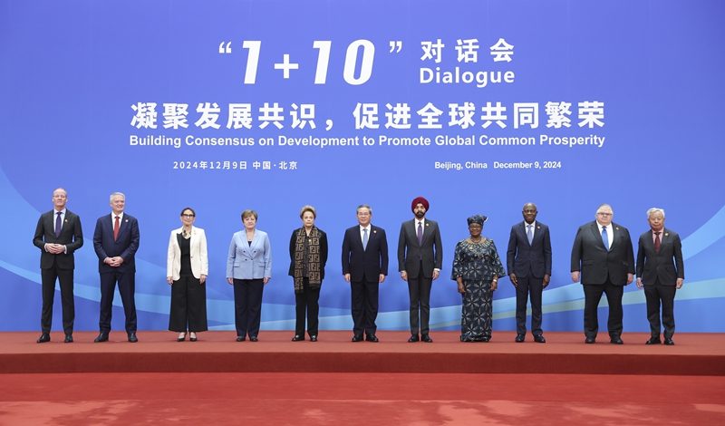 12月9日,国务院总理李强在北京钓鱼台国宾馆同新开发银行行长罗塞芙、世界银行行长彭安杰、国际货币基金组织总裁格奥尔基耶娃、世界贸易组织总干事伊维拉、联合国贸易和发展会议秘书长格林斯潘、国际劳工组织总干事洪博、经济合作与发展组织秘书长科尔曼、国际清算银行总经理卡斯滕斯、金融稳定理事会主席诺特、亚洲基础设施投资银行行长金立群举行“1+10”对话会,围绕“凝聚发展共识,促进全球共同繁荣”主题深入交流。