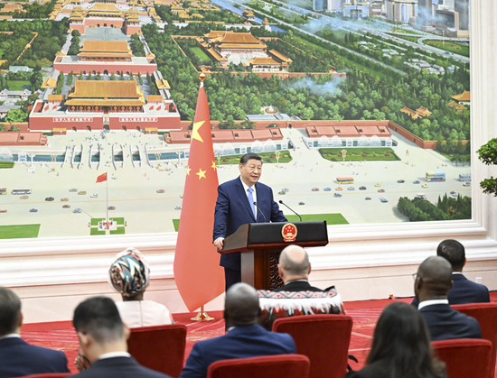 7月25日上午,国家主席习近平在北京人民大会堂接受16位驻华大使递交国书。这是仪式结束后,习近平在北京厅对使节们发表讲话。新华社记者 谢环驰 摄