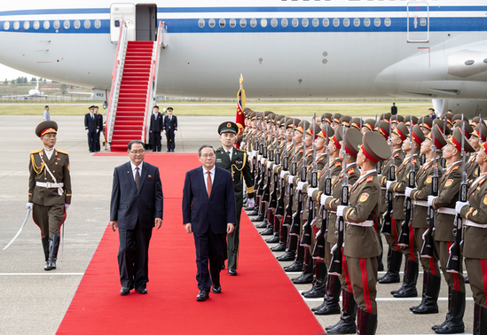 10月9日上午,应朝鲜劳动党中央委员会和朝鲜民主主义人民共和国政府邀请,中共中央政治局常委、国务院总理李强率中国党政代表团乘包机离开北京,赴平壤出席朝鲜劳动党建党80周年庆祝活动并对朝鲜进行正式友好访问。当地时间10月9日中午,李强乘包机抵达平壤顺安国际机场。朝鲜劳动党中央政治局常委、内阁总理朴泰成率党和政府高级官员到机场迎接,并为李强举行欢迎仪式。这是李强在朴泰成陪同下检阅仪仗队。新华社记者 翟健岚 摄