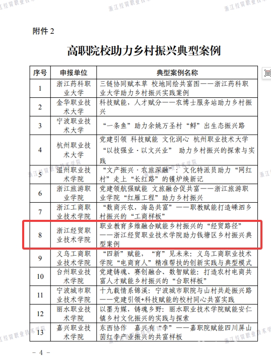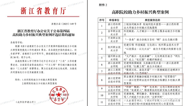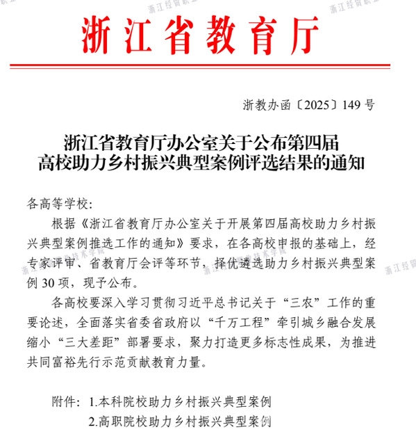 近日,浙江省教育厅办公室发布《浙江省教育厅办公室关于公布第四届高校助力乡村振兴典型案例评选结果的通知》(浙教办函﹝2025﹞149号),经过高校互评、专家评审等多轮严格筛选,全省共有30项案例获评教育助力乡村振兴典型案例。我校报送的《职业教育多维融合赋能乡村振兴的“经贸路径”——浙江经贸职业技术学院助力钱塘区乡村振兴典型案例》成功入选。这是学校第二次获此荣誉,彰显了学校在职业教育服务乡村振兴领域的深厚积淀与示范效应。