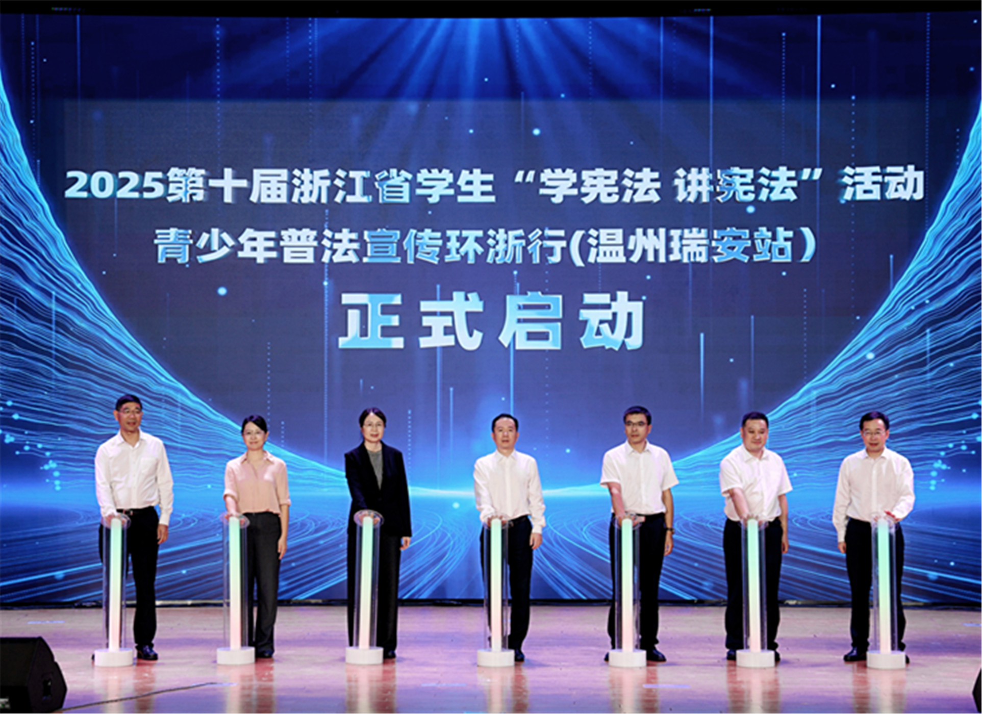 “红旗之下,法治,为信念筑牢根基!”伴随着选手们铿锵有力的演讲,台下观众掌声雷动。10月19日,第十届浙江省学生“学宪法 讲宪法”活动省级决赛展演暨颁奖仪式在浙江省瑞安中学举行。省教育厅党组成员、副厅长陈仁坚出席展演仪式并致辞。省司法厅党委委员、副厅长徐海江,省公安厅、省高级人民法院、省人民检察院相关负责人出席仪式并为获奖选手颁奖。