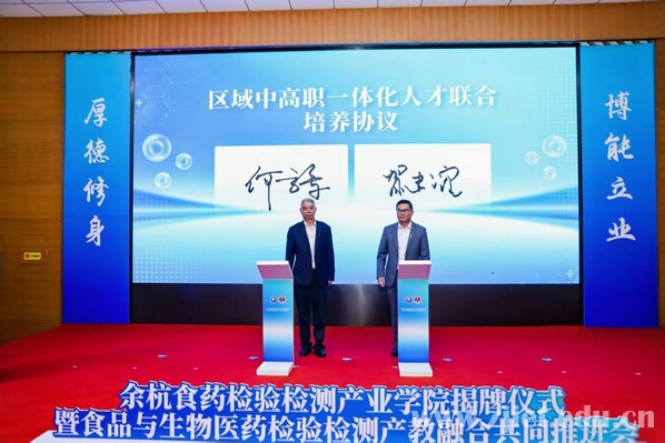 签约仪式上,陈德泉与吴文星签署了《共建余杭食药检验检测产业学院合作协议》,标志着校地合作落地。何学军与良渚职高党总支书记贺建谊签署了《区域中高职一体化人才联合培养协议》,明确“中职筑基、高职提升”的人才培养路径,打通技能人才成长通道。