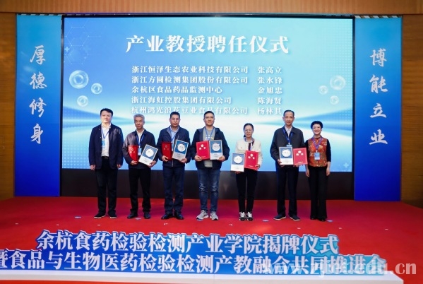 在产业教授聘任仪式上,余杭区政府、市教科院、区经信局、区市场监管局等领导为来自浙江恒泽、方圆检测、余杭区食药监测中心、海虹控股、鸿光浪花、衡美健康、大康食品、博拓生物、赛灵特医药、区食品工业与流通行业协会十家单位代表颁发“产业教授”聘书。