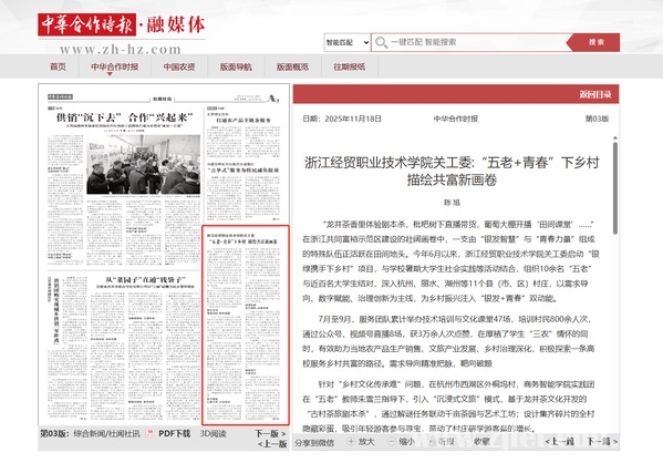 聚焦枇杷产业强却“品牌弱”问题,在杭州市余杭区塘栖村,数字贸易学院特聘“五老”导师唐国标带领学生深入服务,通过打造“枇枇”IP形象,开发 AR明信片、电商小程序,指导村民在枇杷树下直播带货,策划“枇杷叶深加工+短视频科普”等方案,破解村庄品牌传播难题,推动了当地枇杷销售与产业发展,让产业“火起来”。