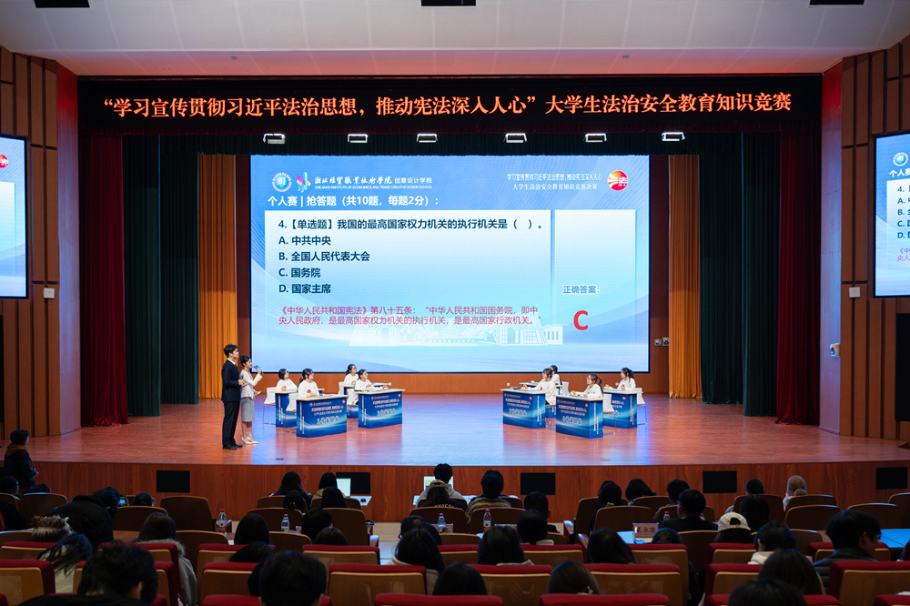 12月2日,浙江经贸职业技术学院创意设计学院举办了“学习宣传贯彻习近平法治思想,推动宪法深入人心”大学生法治安全教育知识竞赛,近千名师生现场参与,以赛促学筑牢青年法治信仰。
