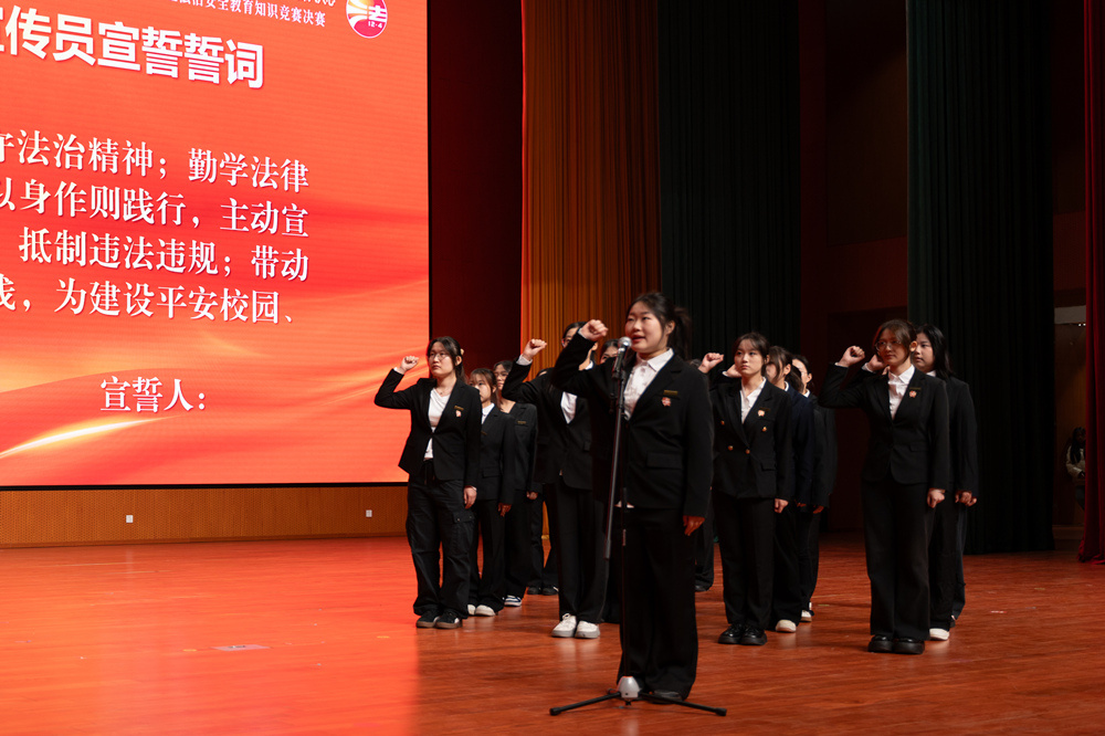 活动现场举行了校园法治安全宣传员聘任仪式,25名学生接过聘书后庄严宣誓“践行法治精神,传播安全理念”。学院声乐队演唱《宪法伴我们成长》,主持队朗诵《以吾辈之名,护宪法之光》,悠扬旋律与激昂语调交织出青春与法治的共鸣。师生集体观看习近平法治思想专题及宪法宣传视频,深化对法治理念的理解认同。
