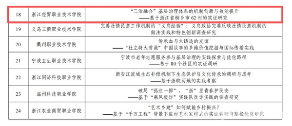 其中,由商务智能学院、创意设计学院、合作经济学院联合报送的《文化基因激活,青春力量赋能——基于淳安“大下姜”64个村的文化振兴调研实践》项目(指导教师:姚水琼、张亚莉)聚焦乡村文化振兴,依托国家“双高计划”专业群优势,深入淳安“大下姜”区域,以文化基因解码与产业赋能为主线,推动校地联动产学研训创深度融合,助力当地发展;由创意设计学院报送的《“三治融合”基层治理体系的机制创新与效能提升——基于浙江省桐乡市62村的实证研究》项目(指导教师:张会敏、吕佩锦)围绕基层治理现代化,赴嘉兴桐乡系统调研“三治融合”实践机制,为治理创新贡献青年智慧。两项实践彰显了我校学子扎根专业、深入基层、服务社会的担当与作为。