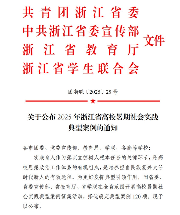 近日,由中共浙江省委宣传部、浙江省教育厅、共青团浙江省委、浙江省学生联合会联合主办的2025年浙江省高校暑期社会实践典型案例征集活动评选结果公布。我校推荐的两个项目从全省众多实践案例中脱颖而出,分别入选“文明文化”与“中国之治”类别省级典型案例,展现了我校实践育人的扎实成效。