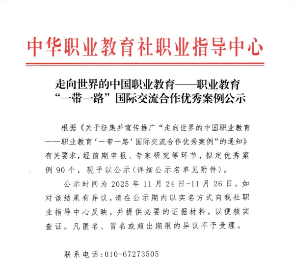 11月24日,中华职业教育社职业指导中心公示“走向世界的中国职业教育——职业教育‘一带一路’国际交流合作优秀案例”,由钱塘区中华职教社申报的“浙江经贸-海纳国际创新中心-钱塘中华职教社推动职教+文化联合出海”案例成功入选,充分展现了钱塘职教探索“职教出海”新模式的前瞻性与实践力,为讲好中国职教故事、深化“一带一路”人文交流贡献了生动而坚实的区域样本。