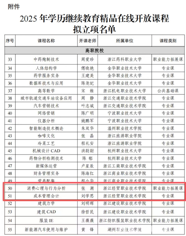 近日,浙江省教育厅正式公布 2025 年高校学历继续教育精品在线开放课程拟立项建设名单。我校数字贸易学院张溯主持的《消费心理与行为分析》、数智财金学院刘学思主持的《成本管理会计》成功入选。