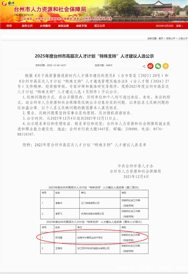 近日,我校精密智造学院数控技术专业毕业生郑冯强入选台州市2025年度高层次人才计划“特殊支持”人才(青年人才层次)。该计划主要面向台州市内具有入选国家及省级人才培养工程潜力的优秀青年人才。