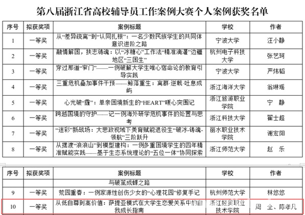 近日,第八届浙江省高校辅导员工作案例大赛结果正式揭晓。经各高校推荐,共收到个人案例、工作案例441篇。经专家评审、网站公示,共有20篇案例获得一等奖,30篇案例获得二等奖,60篇案例获得三等奖。