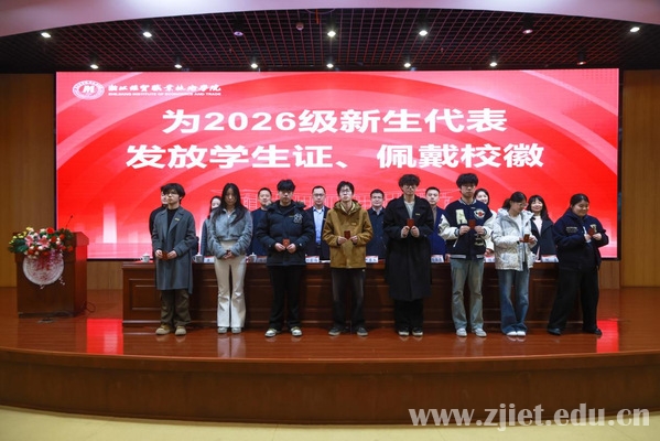 典礼现场,主席台领导为新生代表颁发学生证、佩戴校徽。