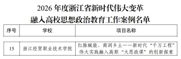 近日,浙江省教育厅发布了《2026年度省高校思想政治工作质量提升综合改革与精品建设项目立项名单的通知》,我校2个项目成功入选。其中,马克思主义学院王兆婷负责的《红脉赋能、商润乡土——新时代“千万工程”伟大实践融入高职“大思政课”的创新探索》入选浙江省新时代伟大变革融入高校思想政治教育工作案例,公共教育学院朱颖入选浙江省高校实践教育名师。两个项目均被推荐至教育部参评。